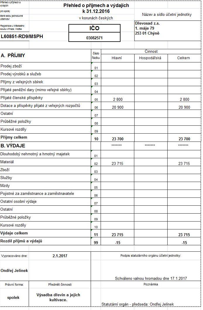 - ze všech dostupných zdrojů bylo zjišťováno jakým způsobem má být vedeno účetnictví Spolku, zejména pak podáno přiznání k dani z příjmu, závěrem vše bylo konzultováno na FÚ Praha-Západ se závěrem, že Spolek nemá žádný příjem, který by podléhal dani z příjmu (členské příspěvky a dotace obce se do příjmů podléhajícímu dani nepočítají) a tudíž nemusí přiznání k dani podávat (ani se k dani registrovat)